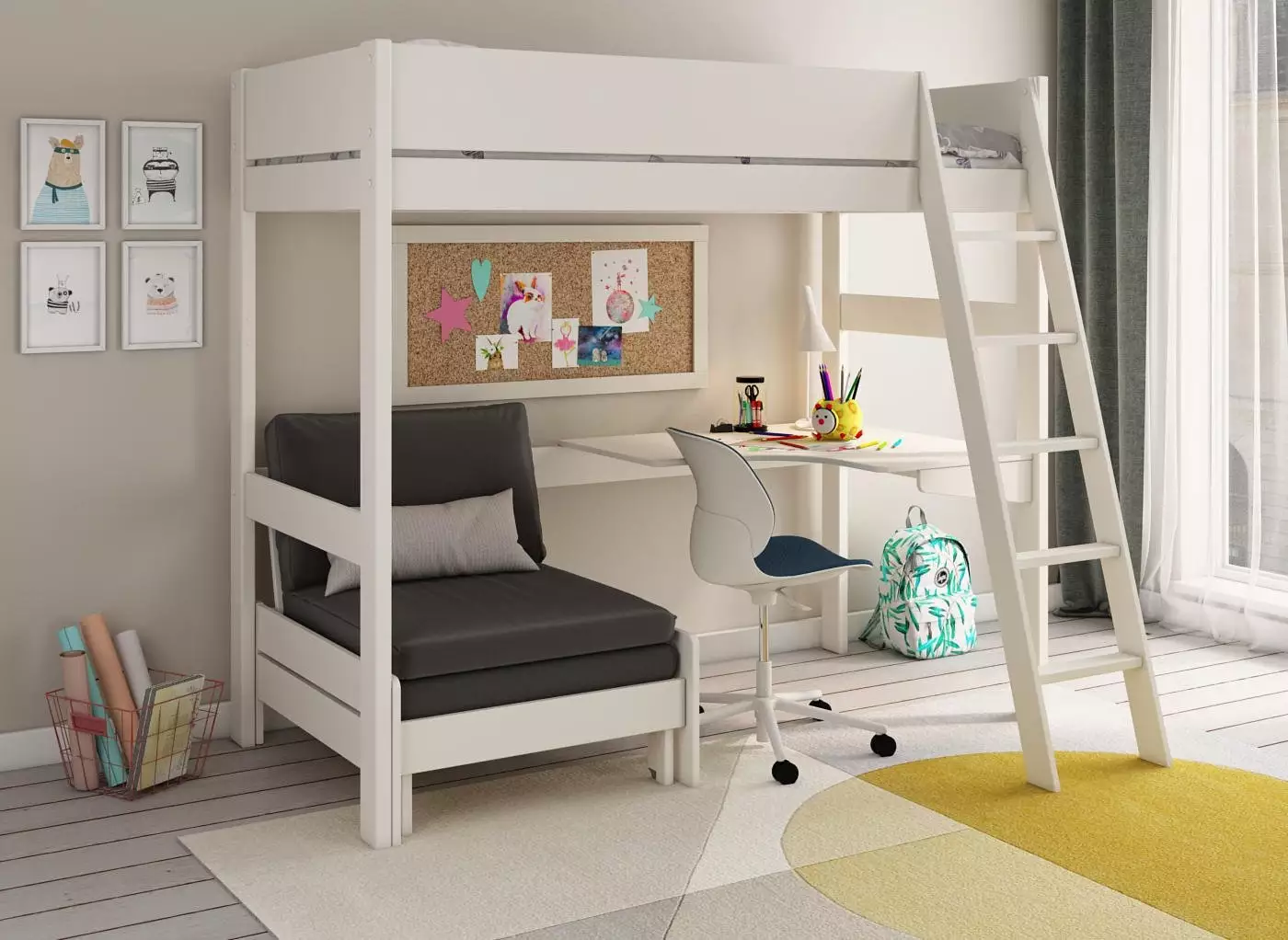 Our Anderson high sleeper with four shelves, three drawers and a chair that pulls out into a futon bed is an ideal storage and sleepover solution for older kids.